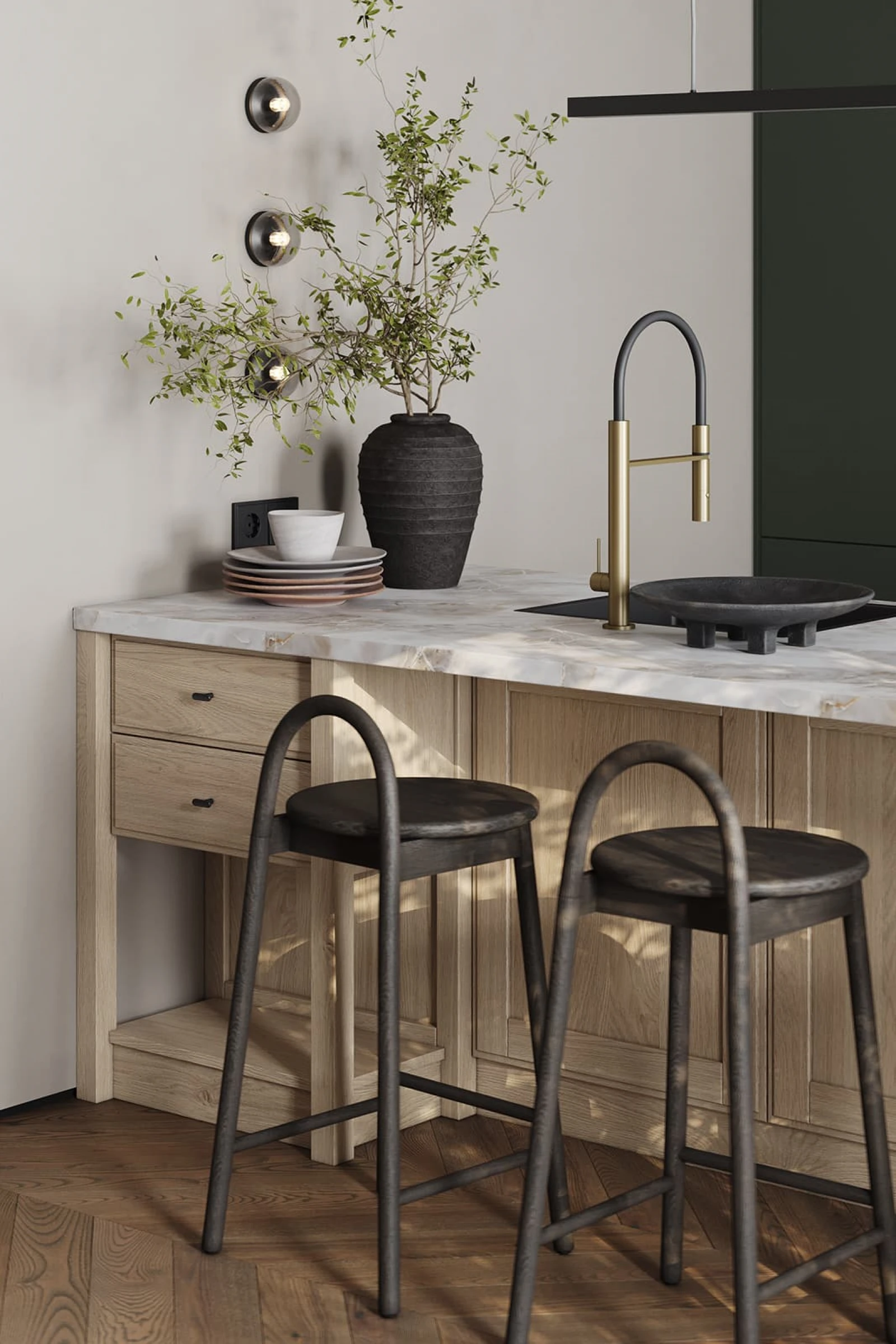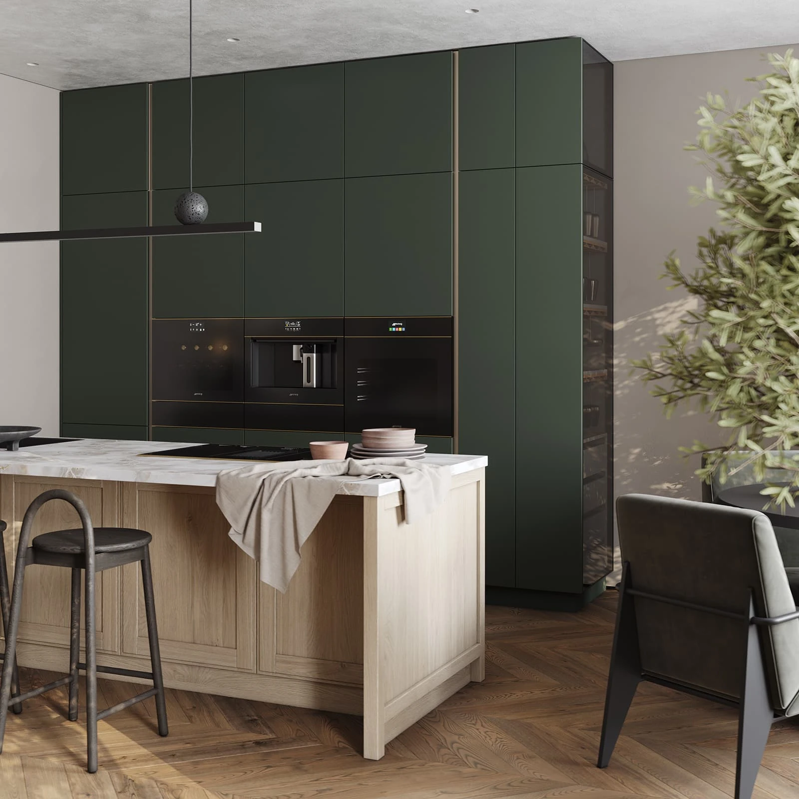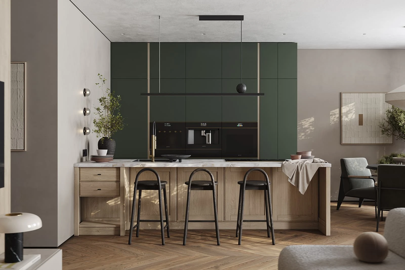 ФАСАДЫ Т737 Натуральный дуб, цвет #189 (воскобейц Белый) / ЛМДФ EVOSOFT, цвет Сумрачный Нефрит, СТОЛЕШНИЦА Пластик HPL, 38 мм, декор Мерида