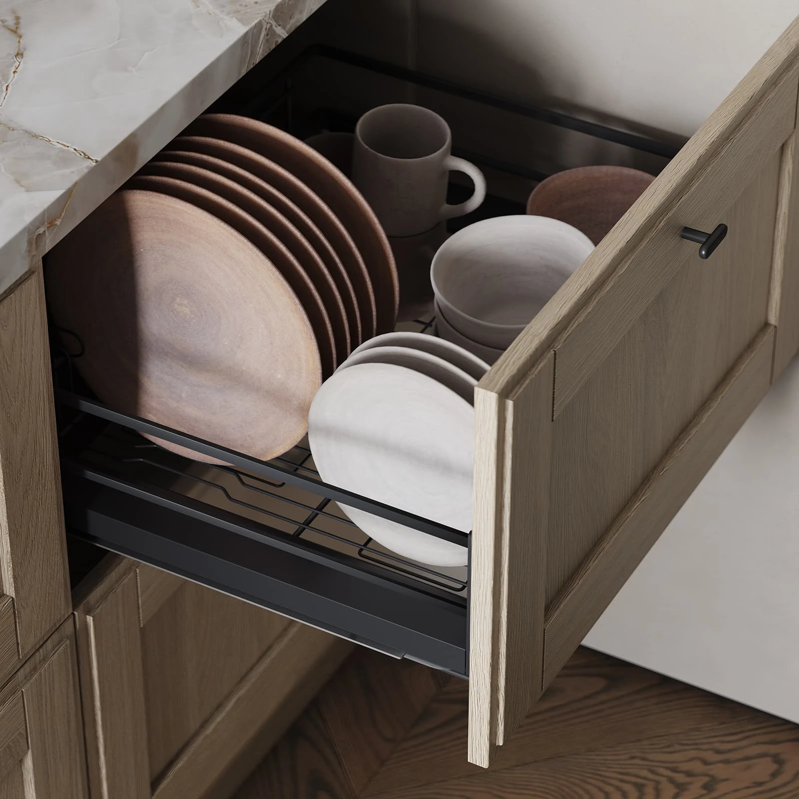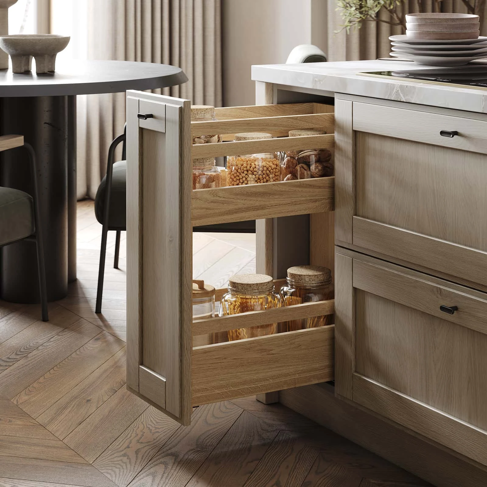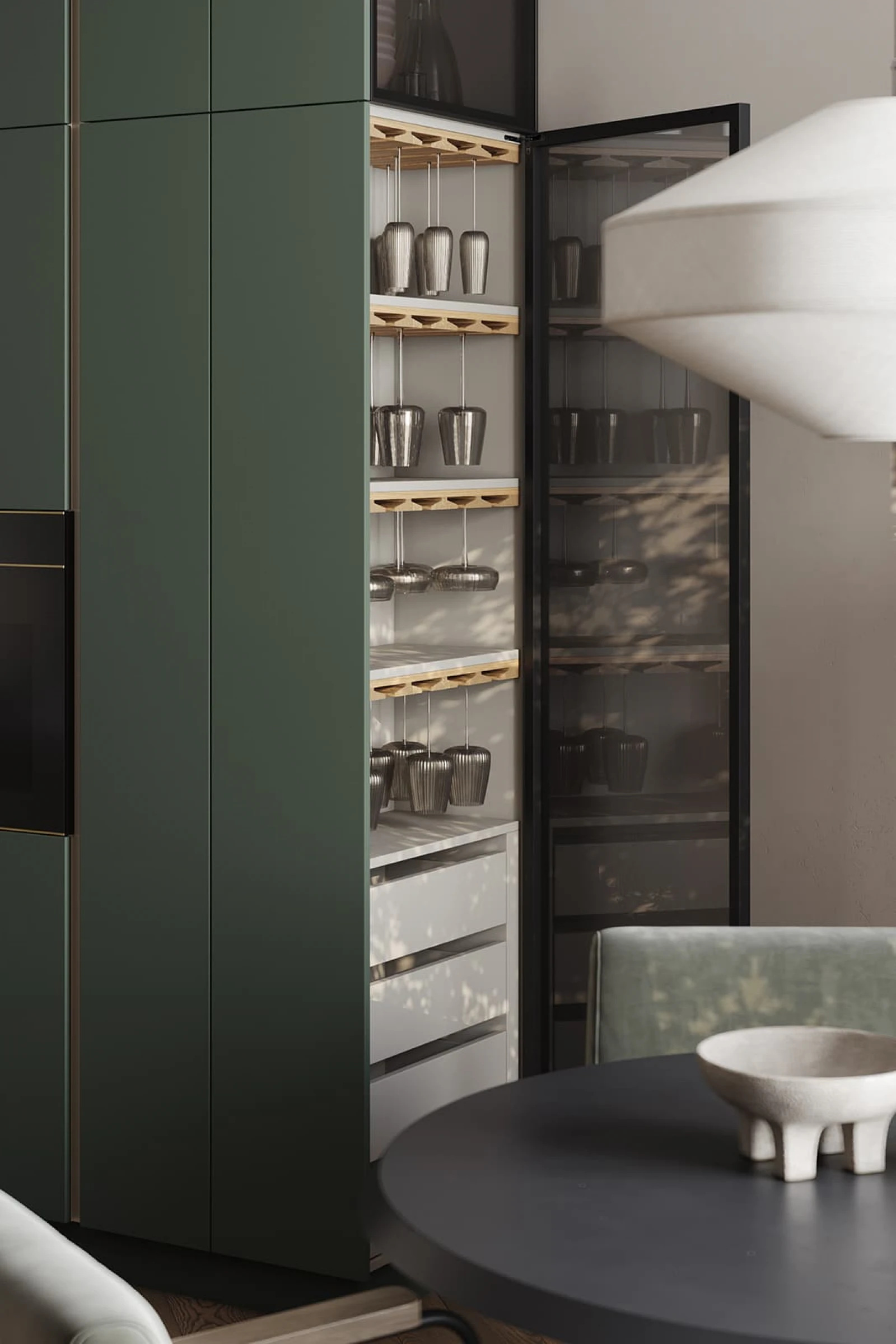 ФАСАДЫ Т737 Натуральный дуб, цвет #189 (воскобейц Белый) / ЛМДФ EVOSOFT, цвет Сумрачный Нефрит, СТОЛЕШНИЦА Пластик HPL, 38 мм, декор Мерида