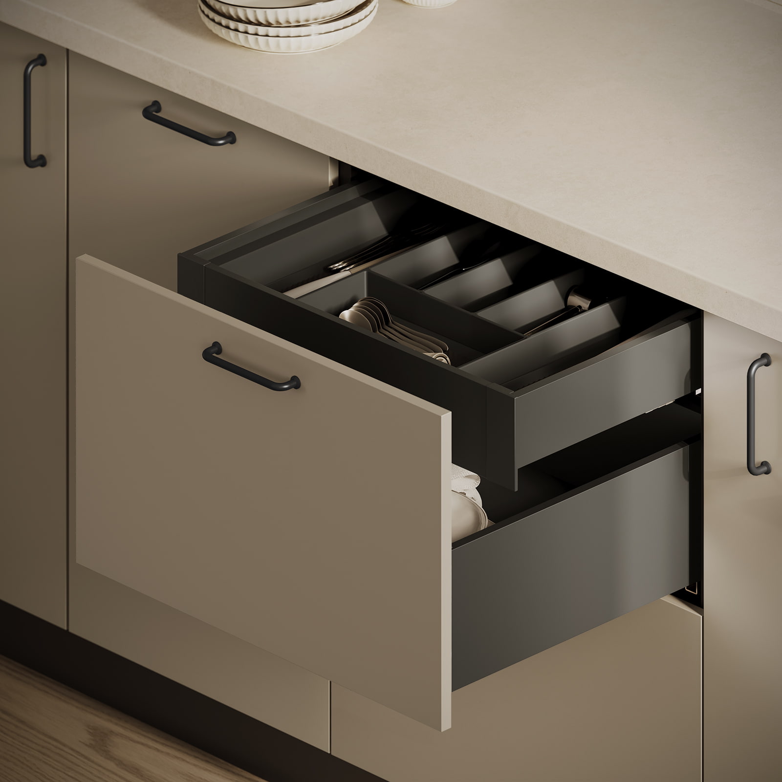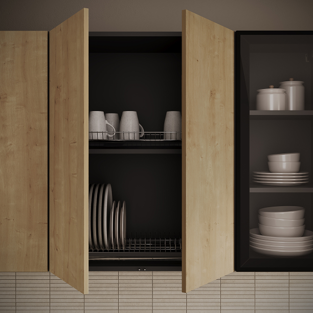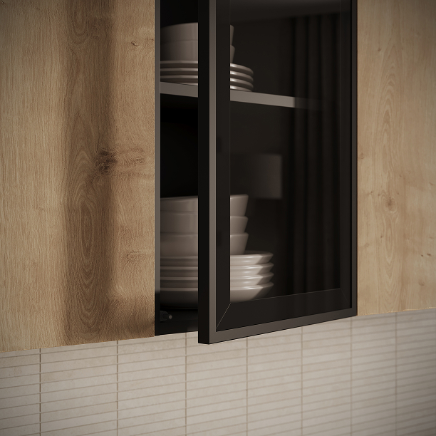ЛМДФ EVOGLOSS, цвет Матовый Новый Серый / ЛДСП Вуд, декор Гамильтон Натуральный / алюминиевый профиль А-2 Терра Черная (стекло Графит прозрачное),