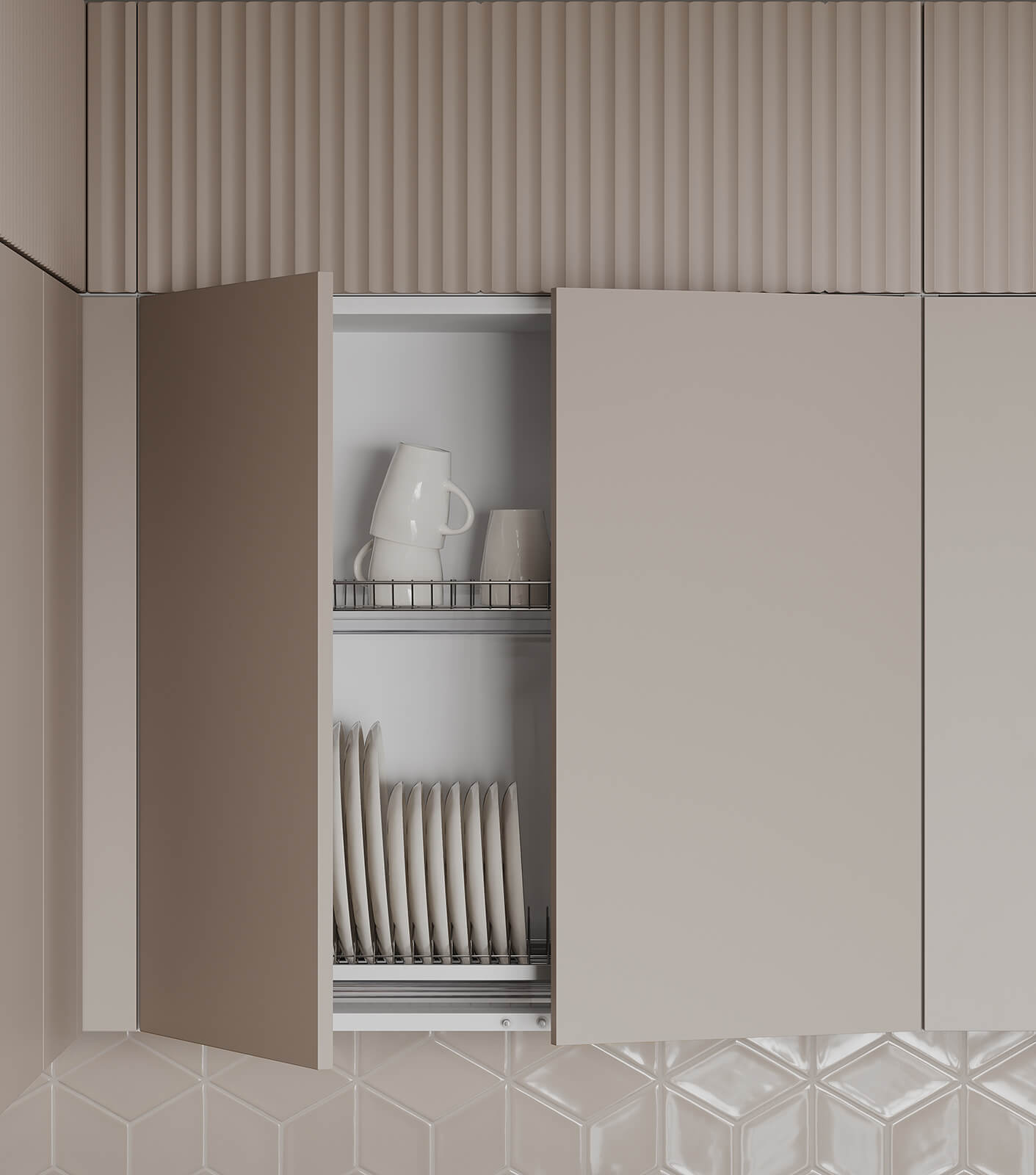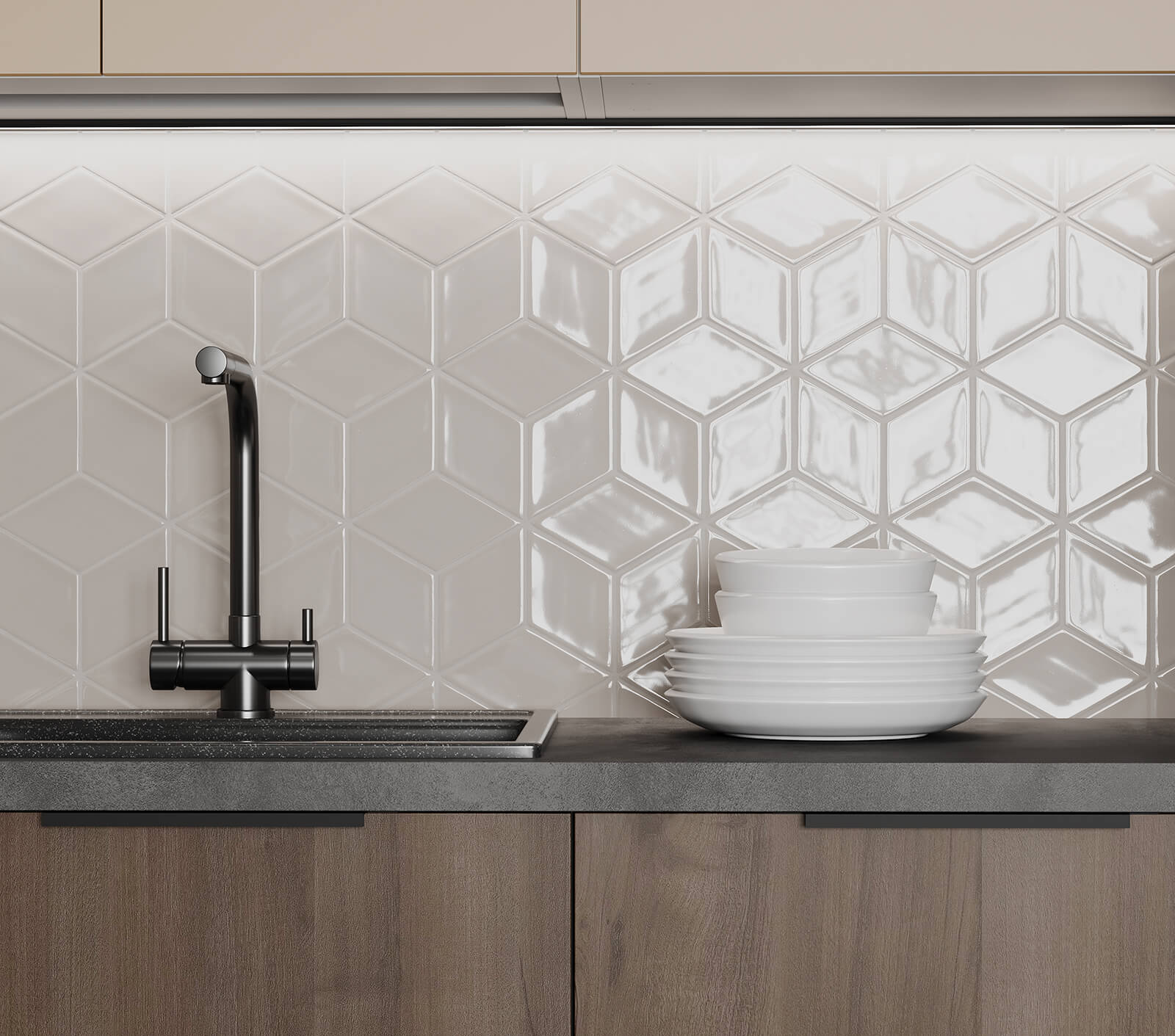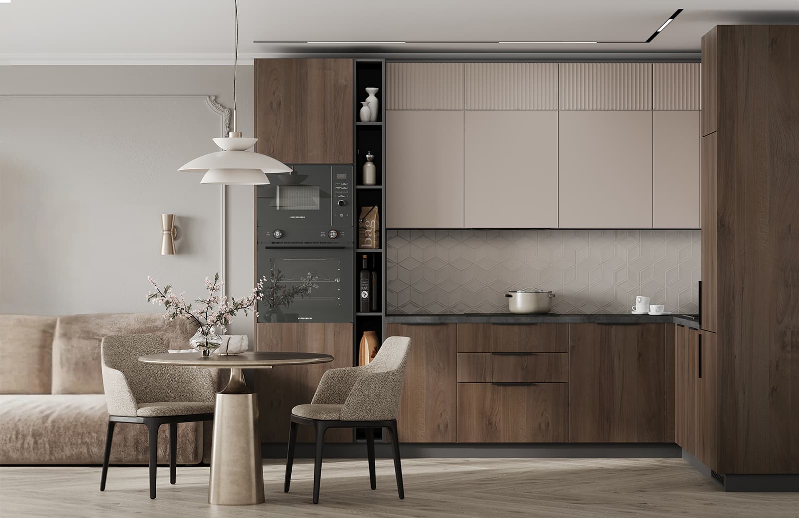 Фасады Авис (МДФ/ПВХ), цвет Сатин Песочный Ф Premier Matt / МДФ/ПВХ, цвет Сатин Песочный Ф Premier Matt / ЛДСП 18 мм, декор Орех Пацифик, Столешница Пластик HPL, декор Детройт (толщина 38 мм, кромка ABS), Корпус ЛДСП, цвет Графит / Белый Премиум (толщина 18 мм)