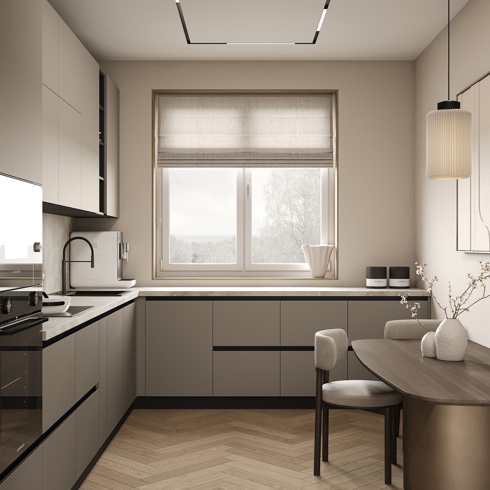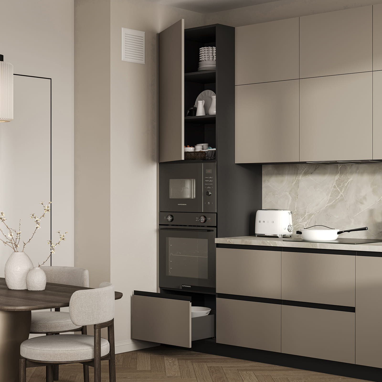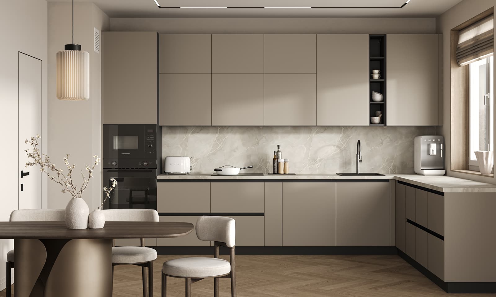 Фасады ЛМДФ PRIME, цвет Меринос, Столешница Пластик HPL, декор Мерида (толщина 38 мм, постформинг), Корпус ЛДСП, цвет Графит (толщина 18 мм)