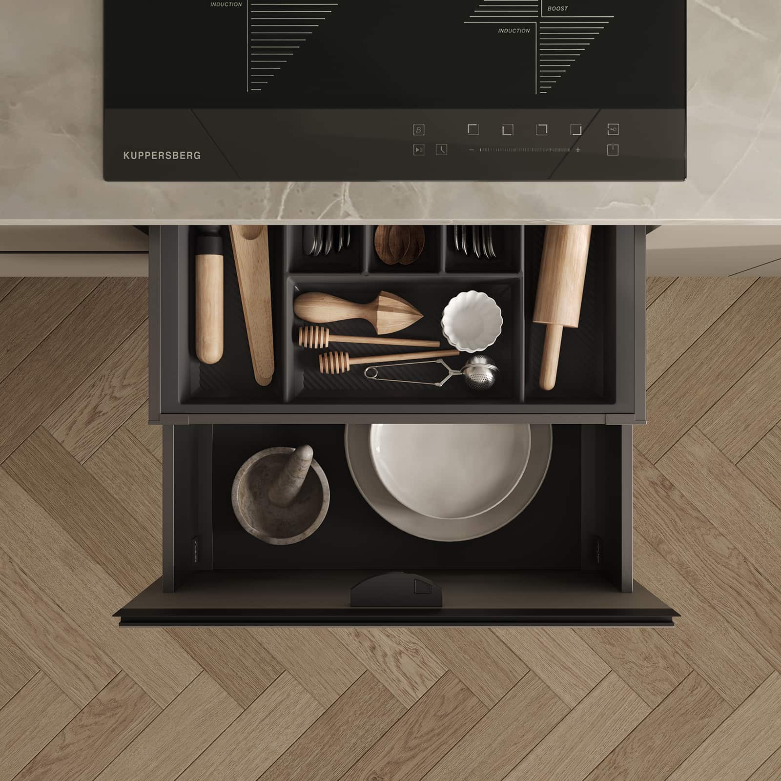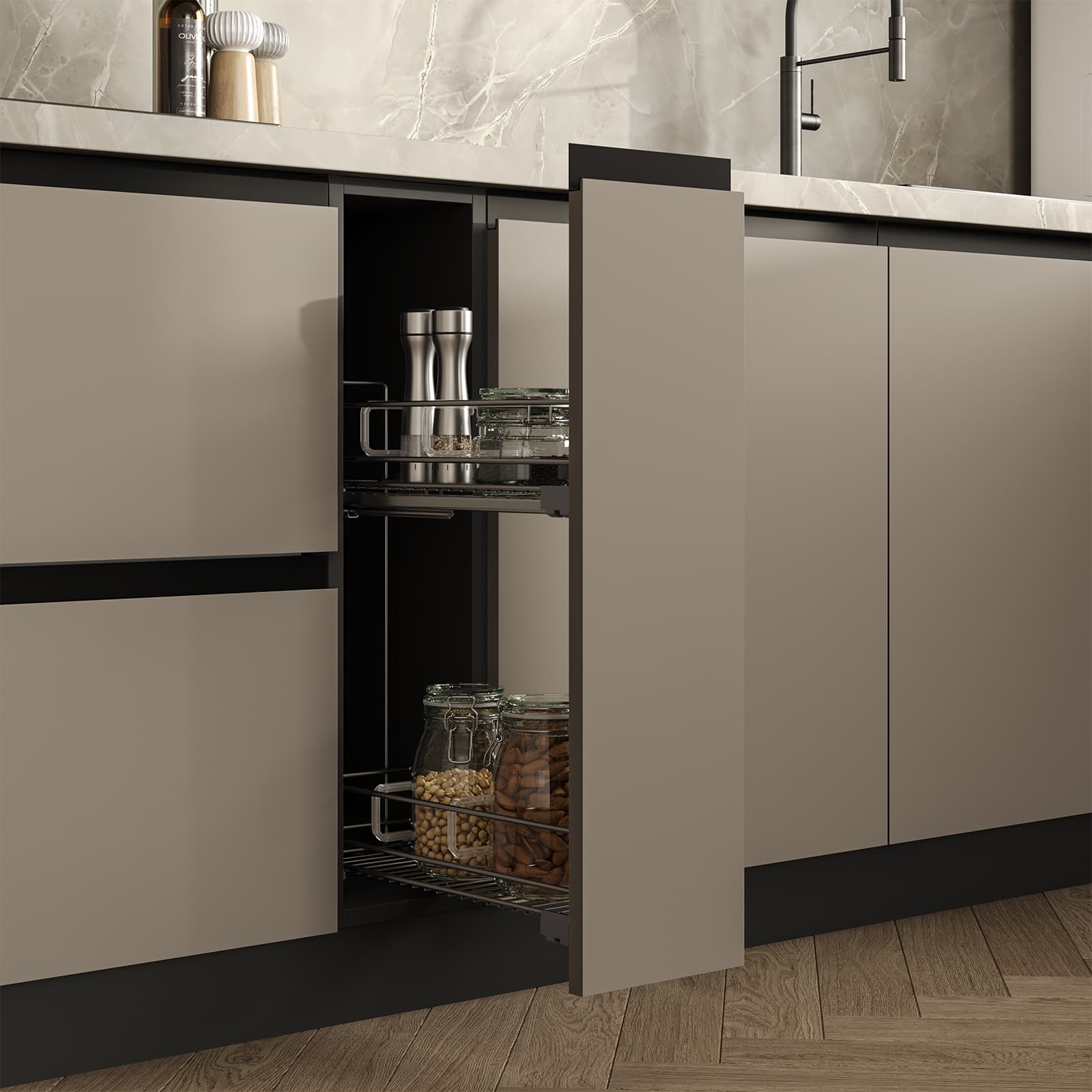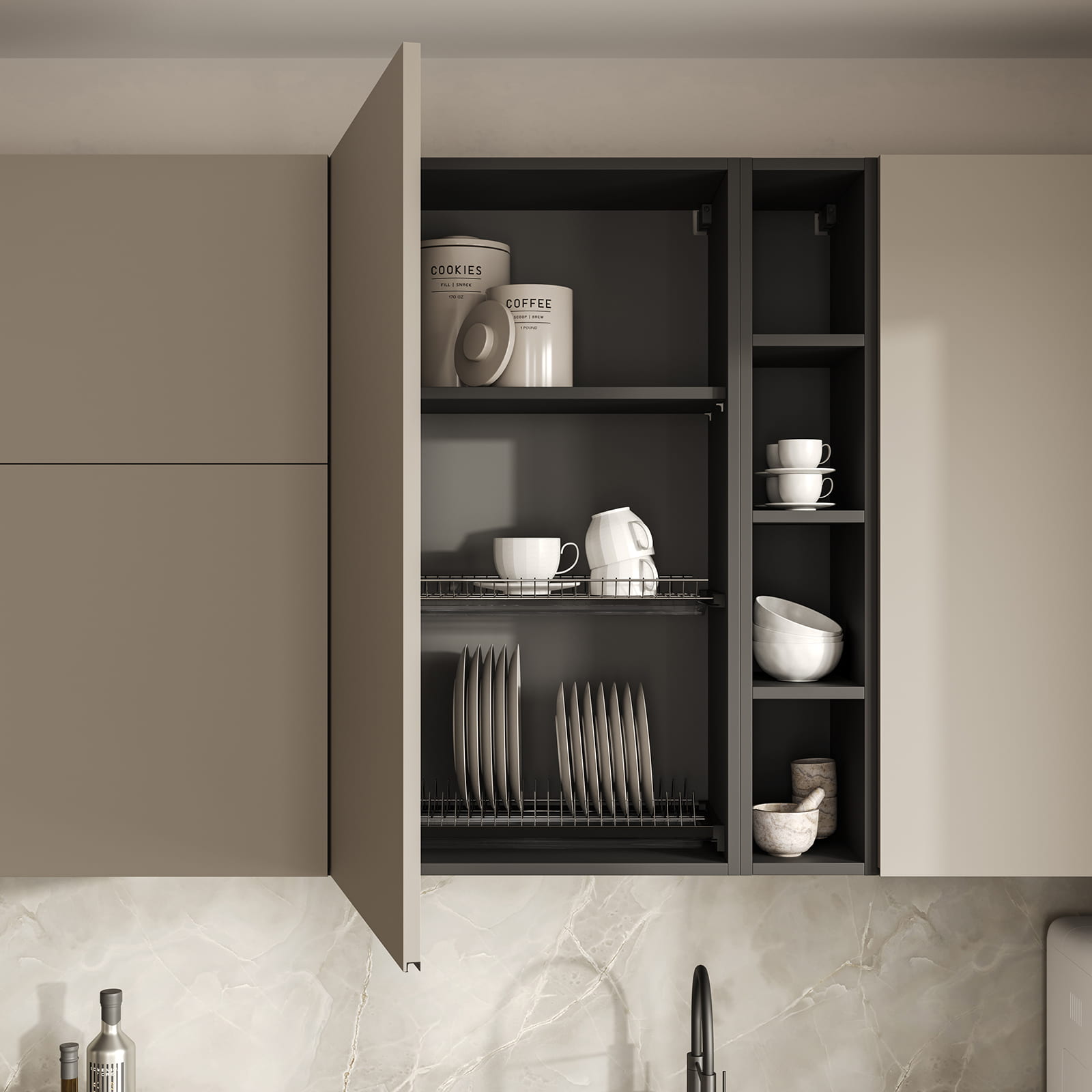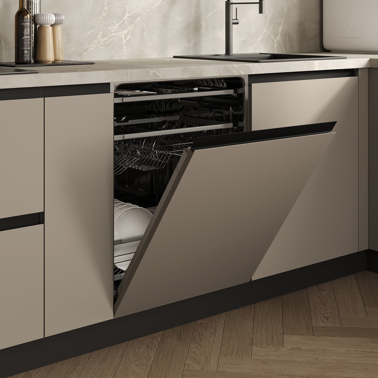Фасады ЛМДФ PRIME, цвет Меринос, Столешница Пластик HPL, декор Мерида (толщина 38 мм, постформинг), Корпус ЛДСП, цвет Графит (толщина 18 мм)