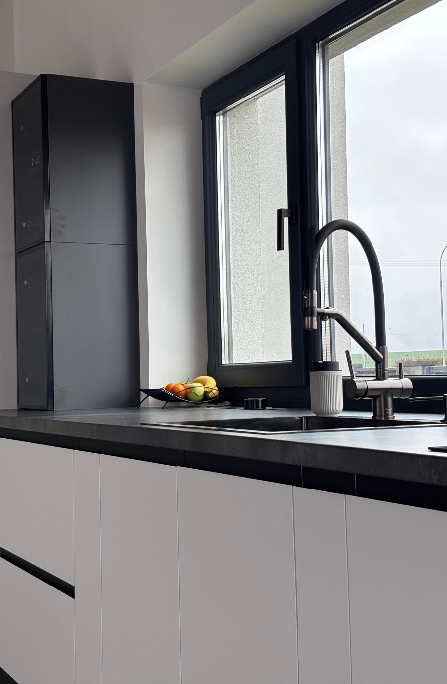 Матовый светло-серый, стекло графит в рамке Терра черная