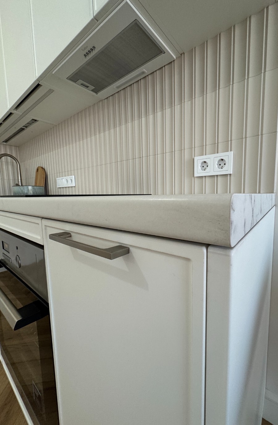 Минималистичная кухня в светлых тонах с древесной текстурой
