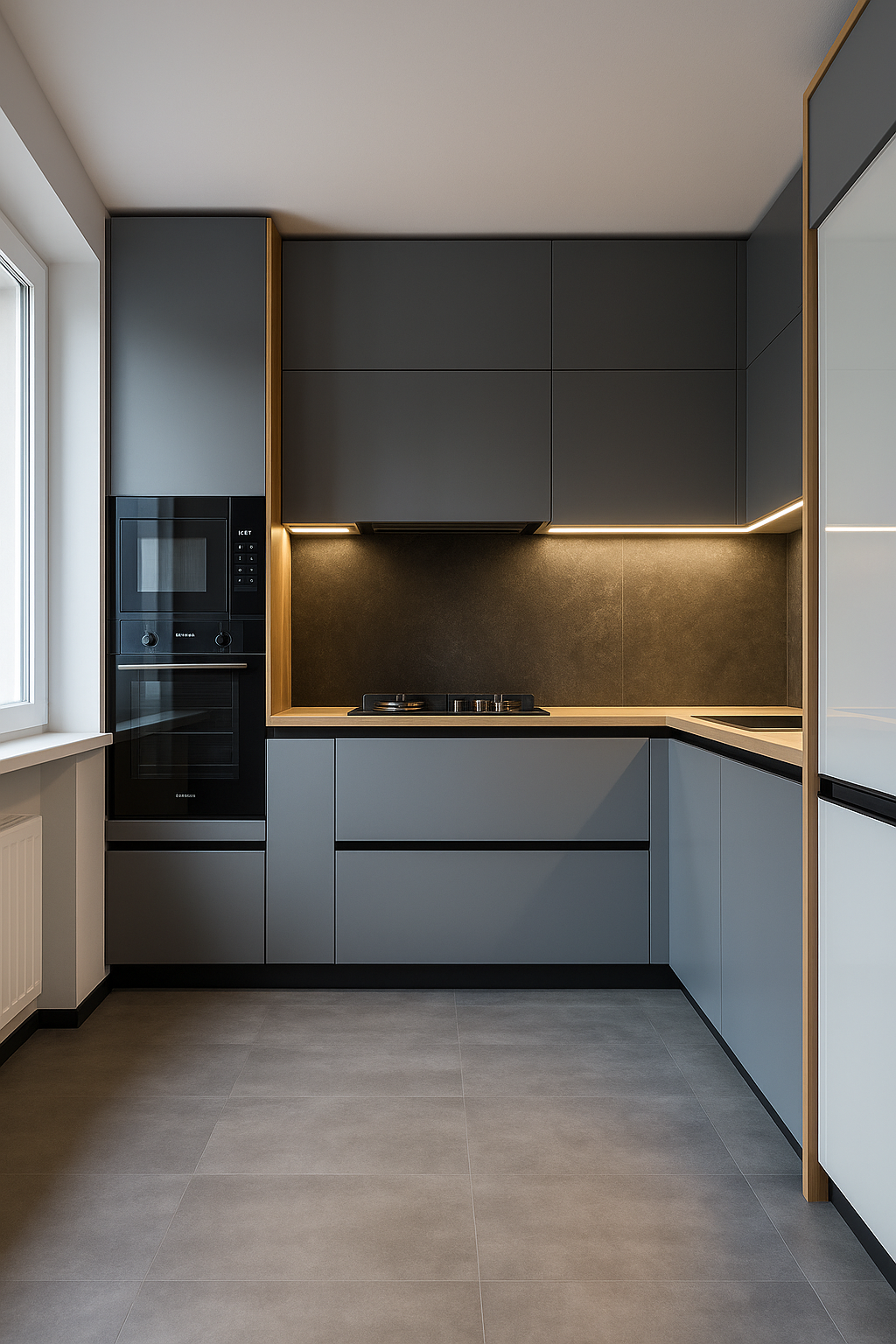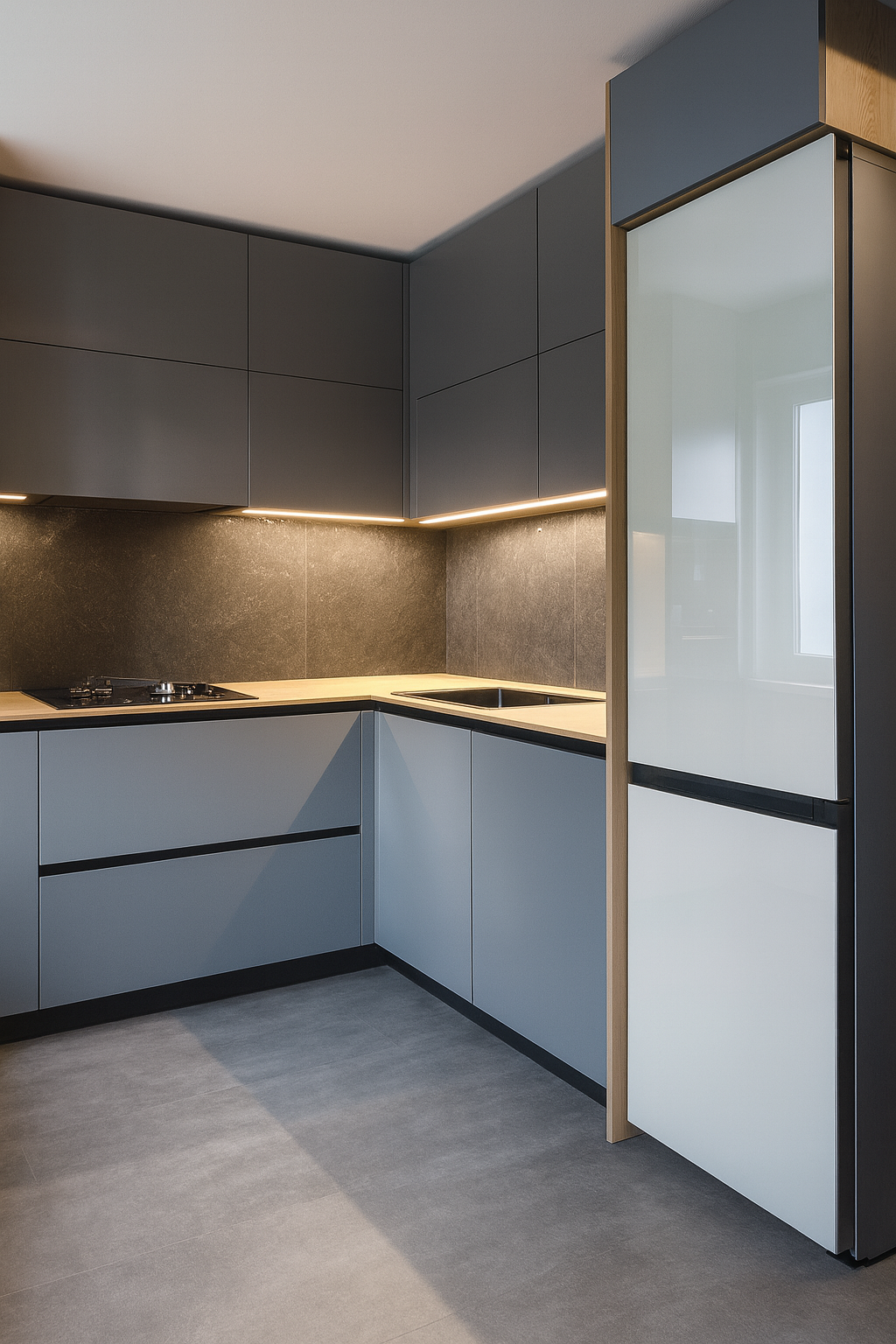 Современная серая кухня с подсветкой