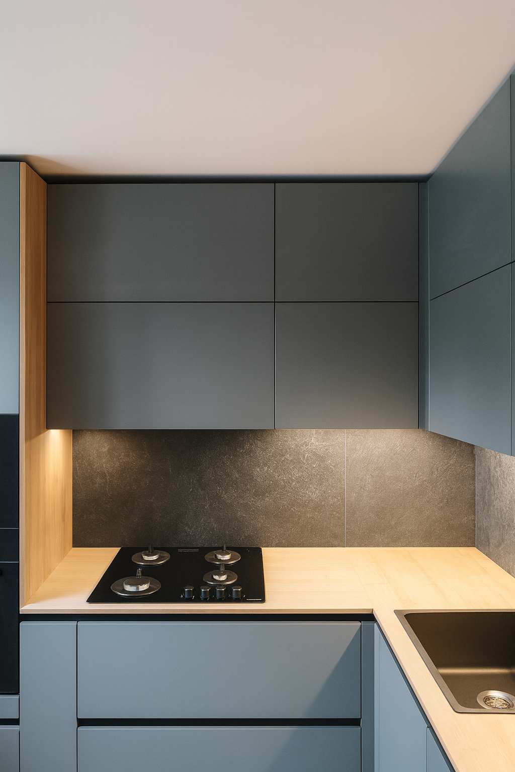 Минималистичная кухня в светлых тонах с древесной текстурой
