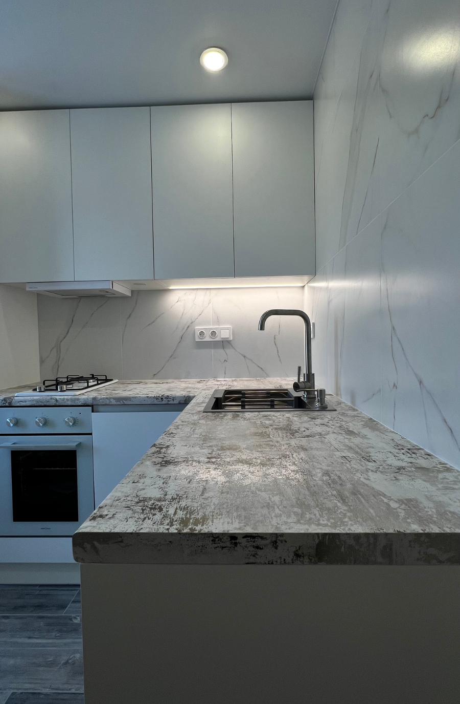 Минималистичная кухня в светлых тонах с древесной текстурой